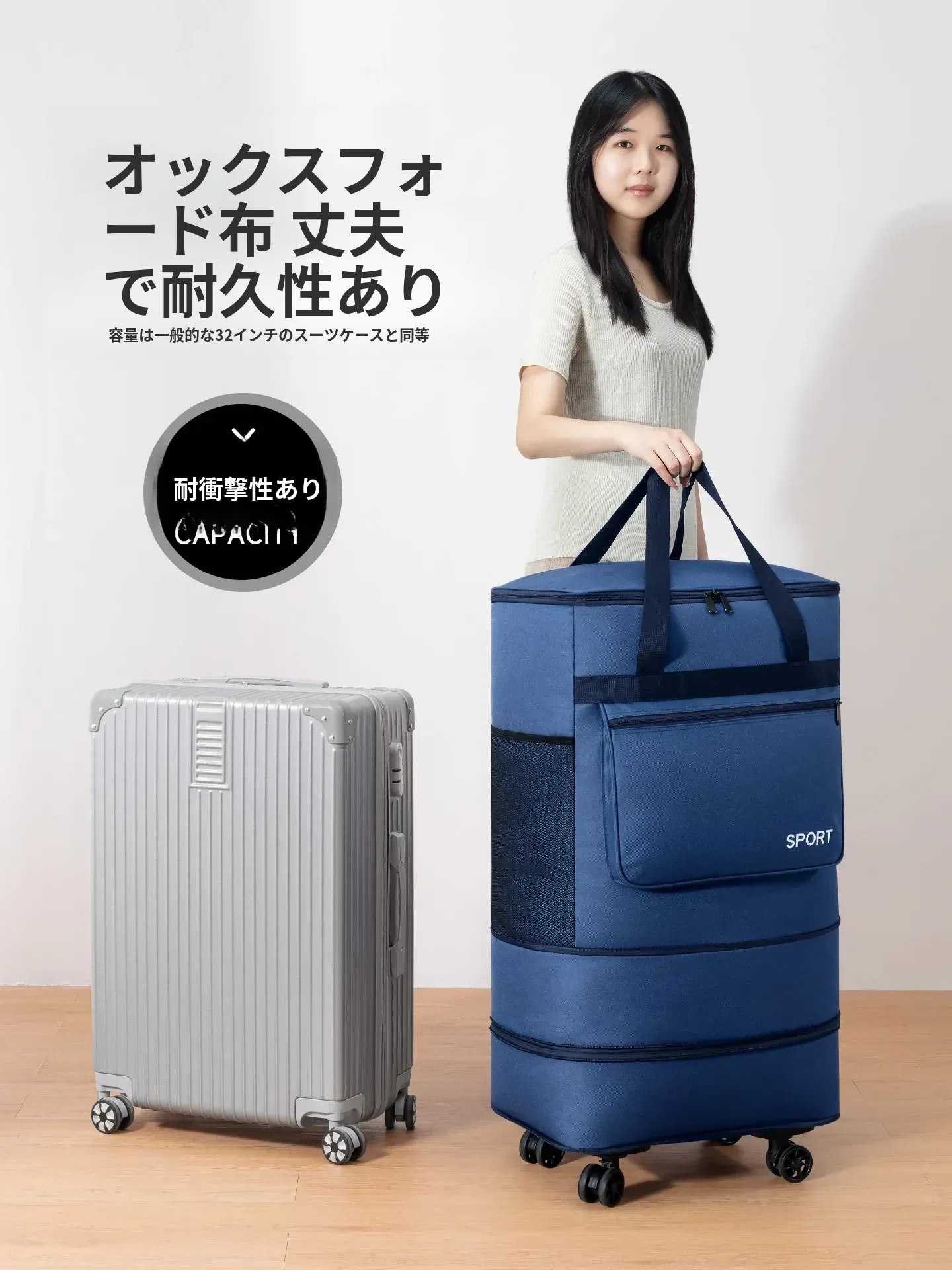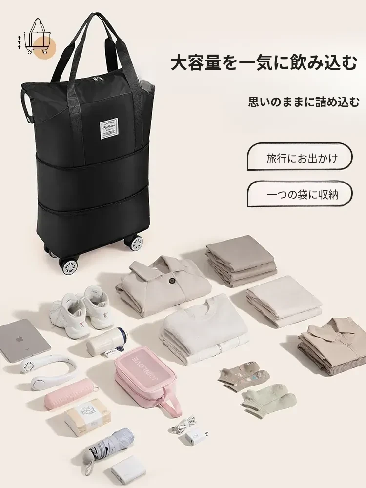 学生向け!開学にぴったりの大容量キャリーケース付き収納バッグ、衣類整理に最適なキャリーバッグです。便利なローラー付きで持ち運びラクラク!