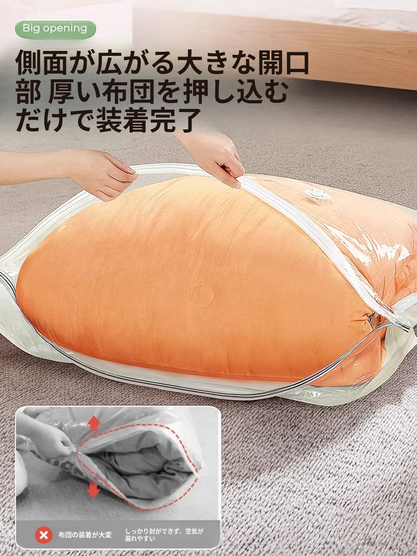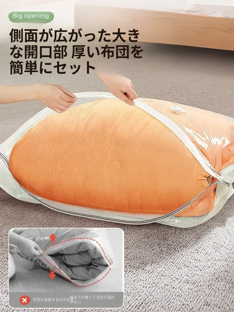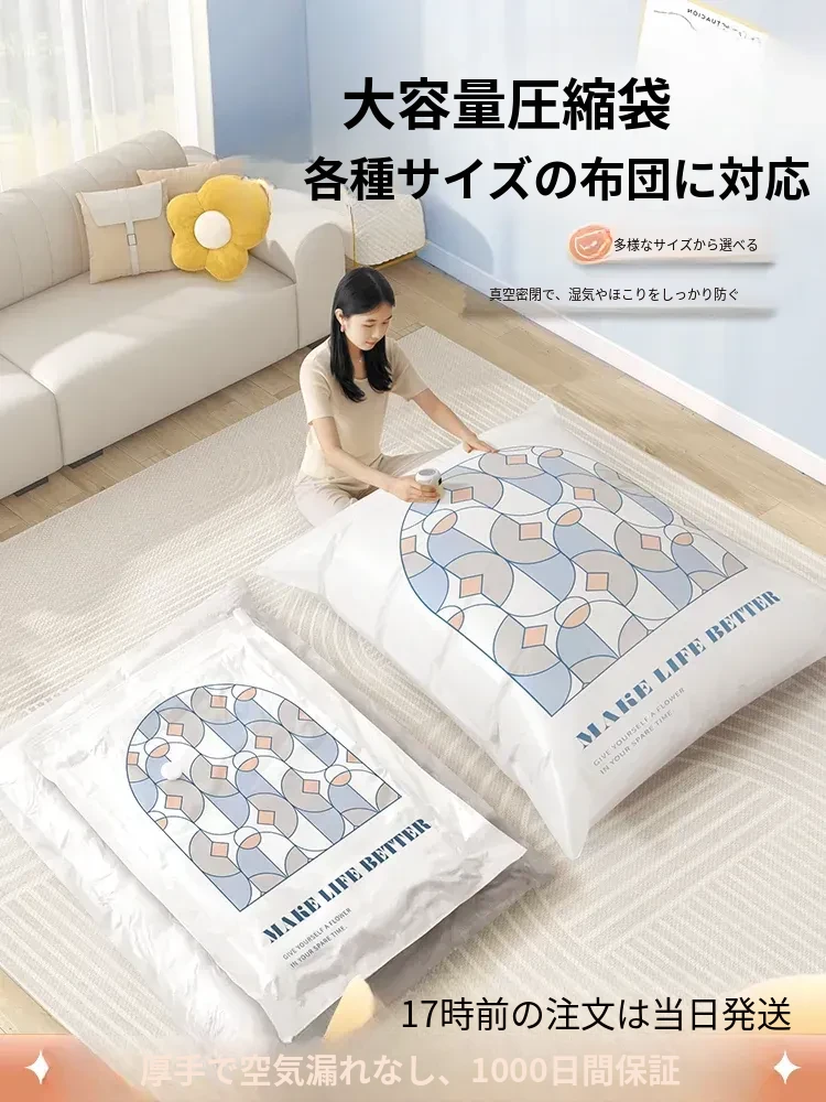 特大号真空圧縮袋 - ふわふわの羽毛布団や衣服をコンパクトに収納!防水・防湿機能付きで、衣類や布団をしっかり保護。スペースを有効活用して、クローゼットもスッキリ整理!