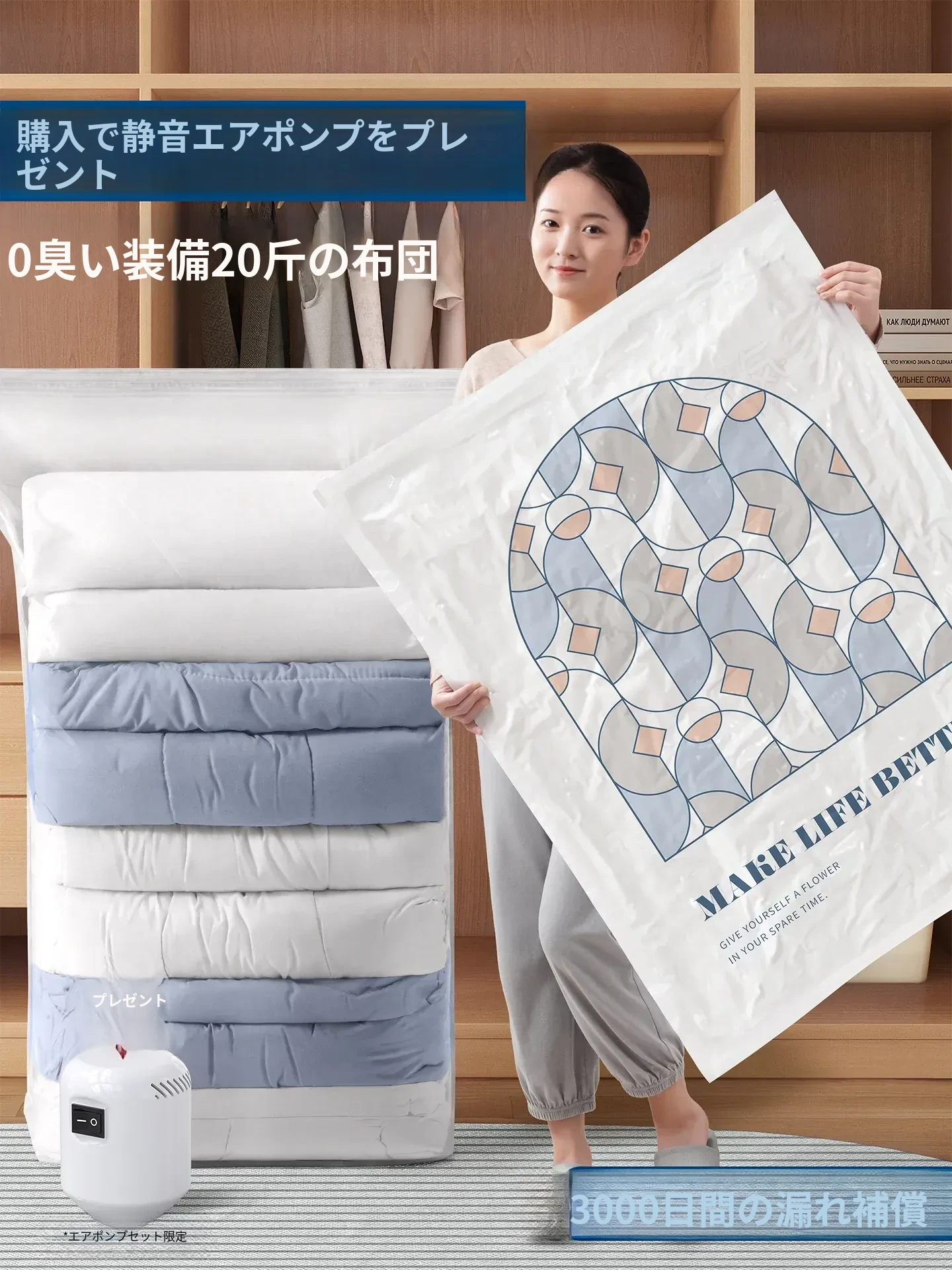 真空圧縮袋|衣類・布団収納に最適!家庭用電動ポンプ対応|衣服・羽毛布団をしっかり圧縮して省スペースを実現!整理整頓が簡単に!