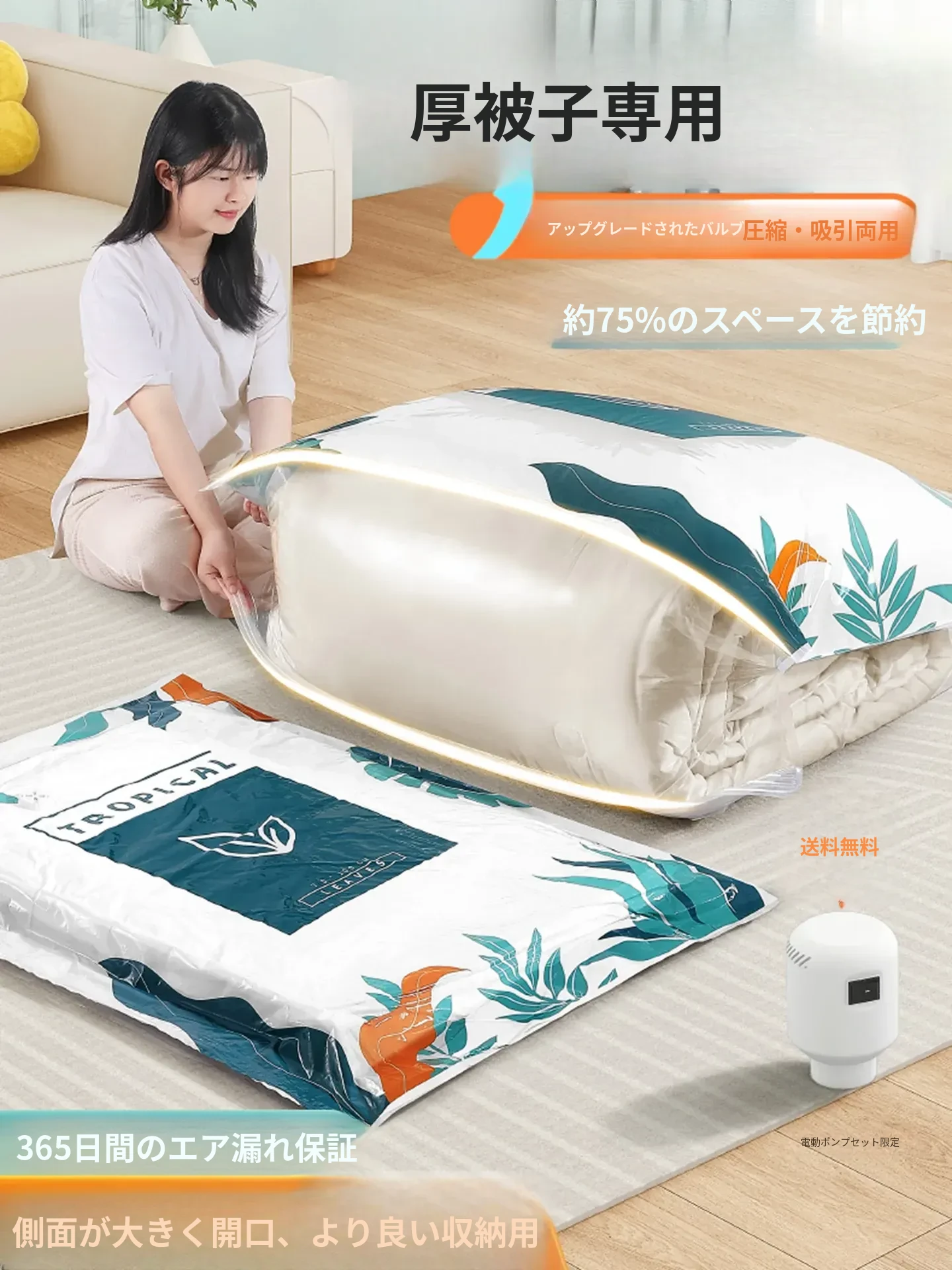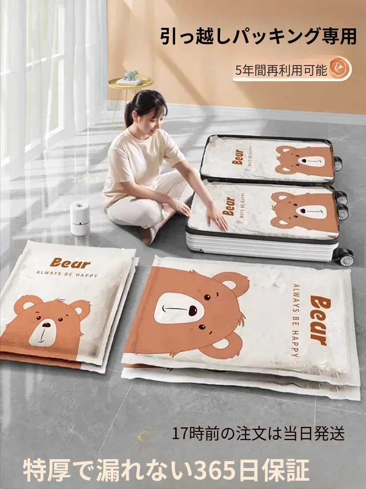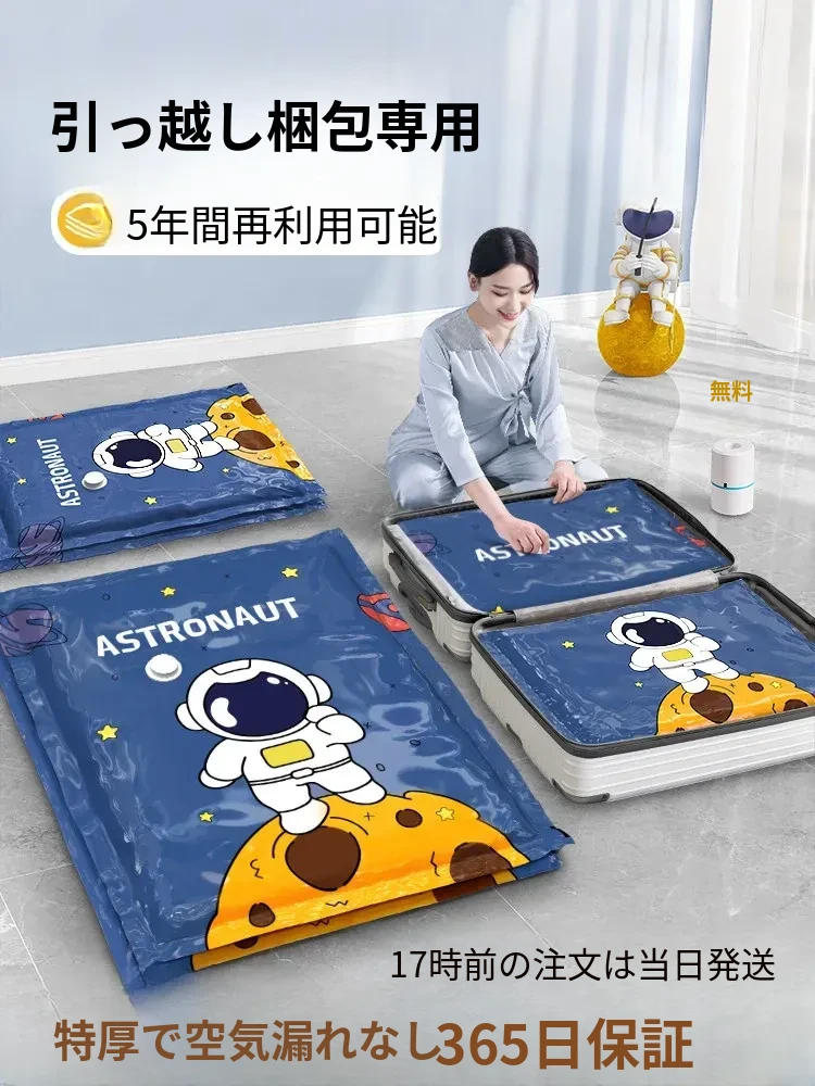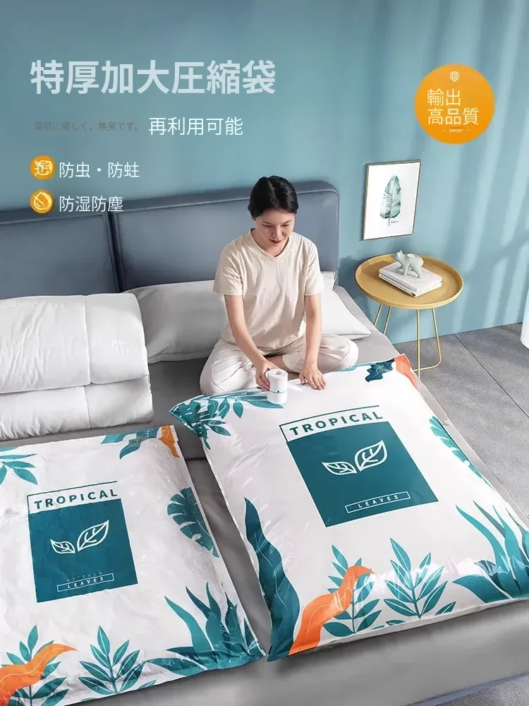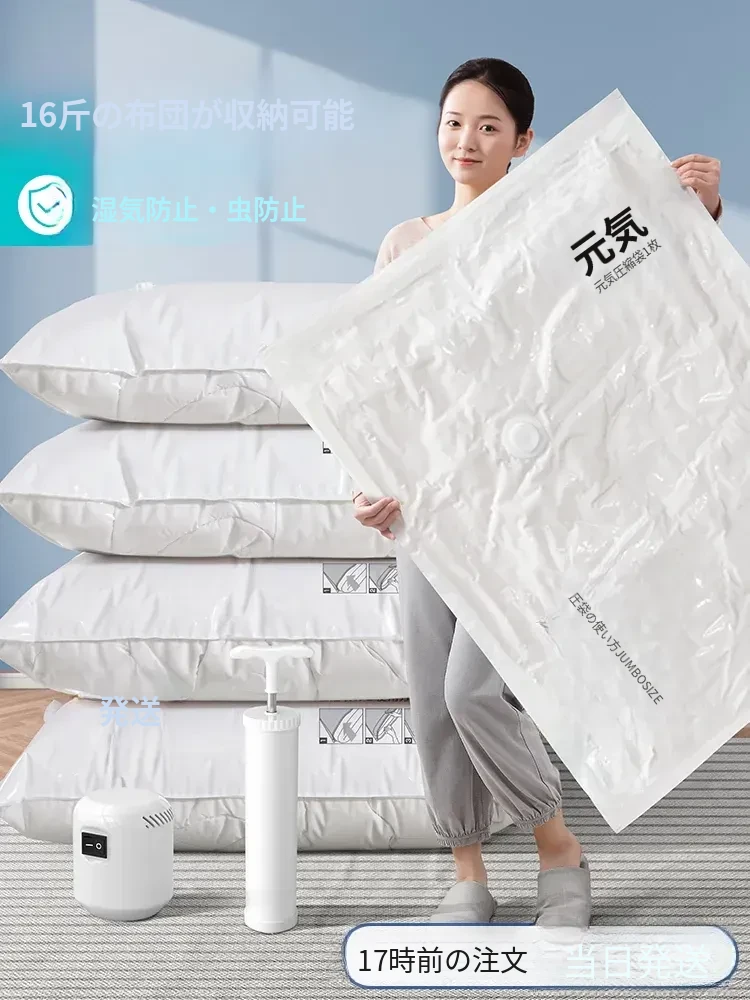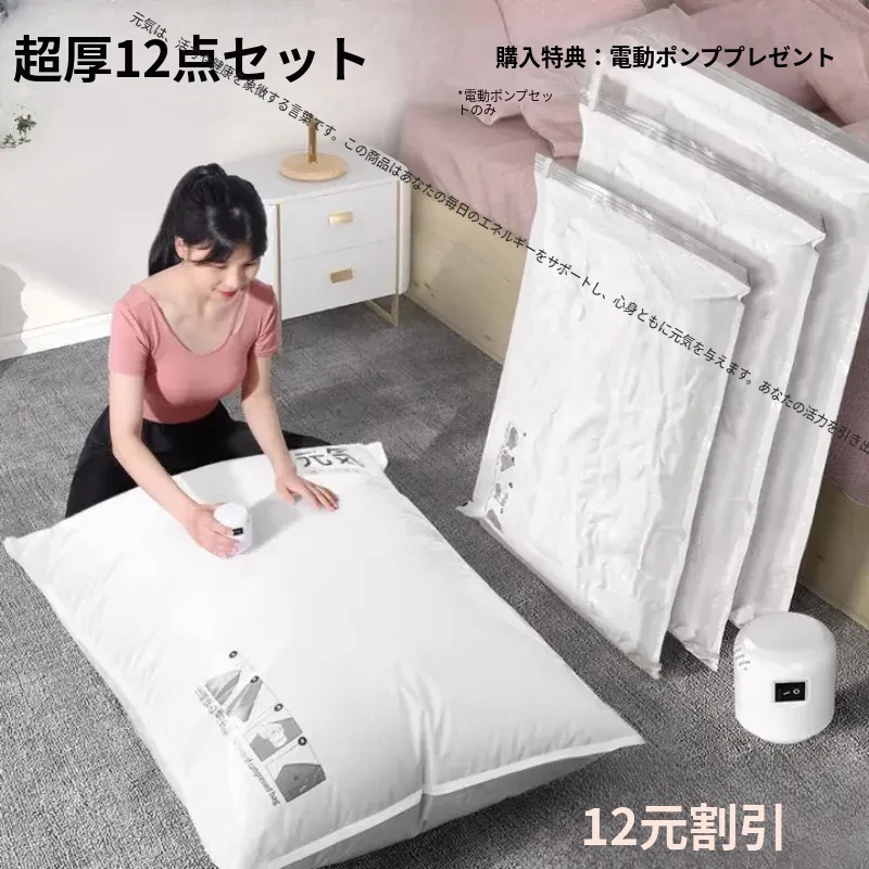 超厚真空圧縮袋!布団や衣類、ダウンジャケットもすっきり収納できる特大サイズ。旅行や引越しに最適!電動ポンプ付きで簡単操作。荷物をコンパクトにまとめて、スペースを有効活用しましょう!