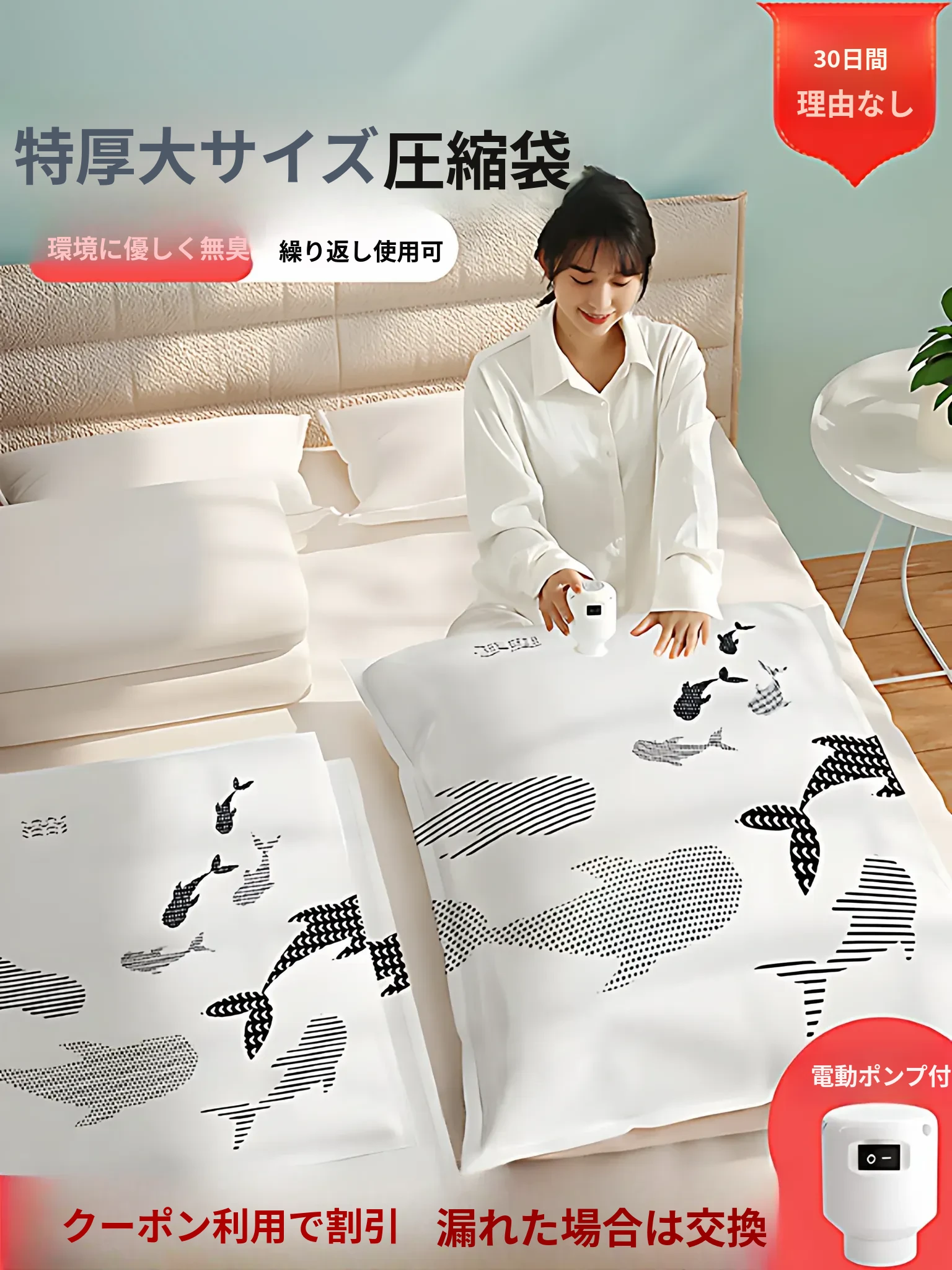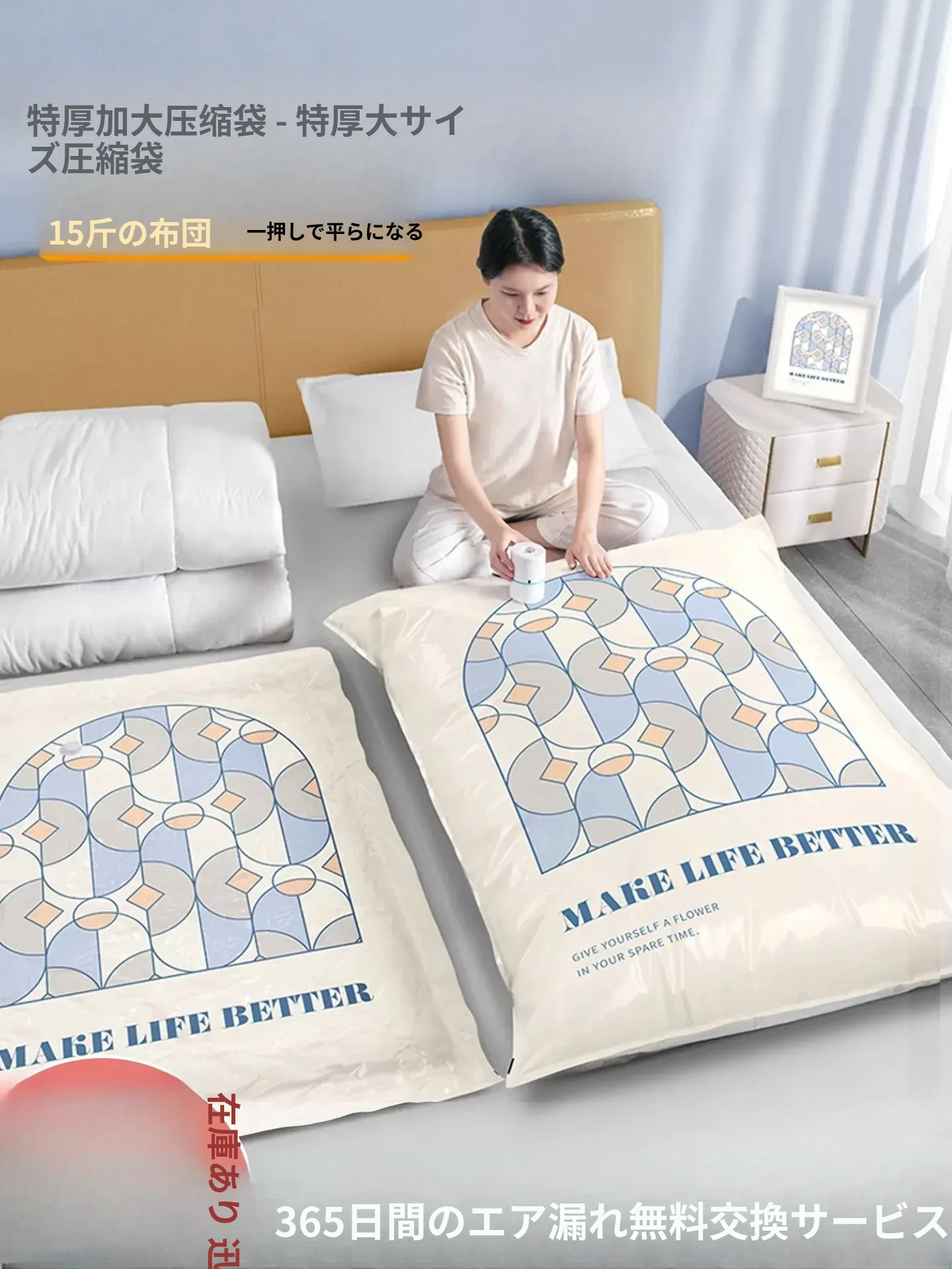 厚手真空圧縮袋 - ふんわり布団や衣類をスッキリ収納!空気を抜いてコンパクトに!羽毛布団やダウンジャケットにも最適な収納アイテム!