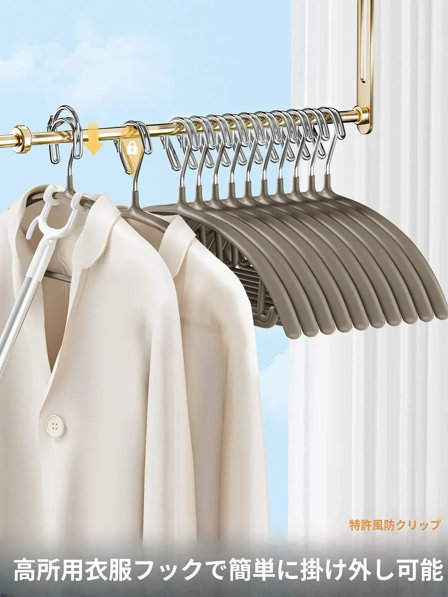 風を防ぐ衣服ハンガー 自動ロック付き 厚手で頑丈な家庭用 ずれ落ちない無痕設計 高層マンション専用 洗濯物干しに最適!