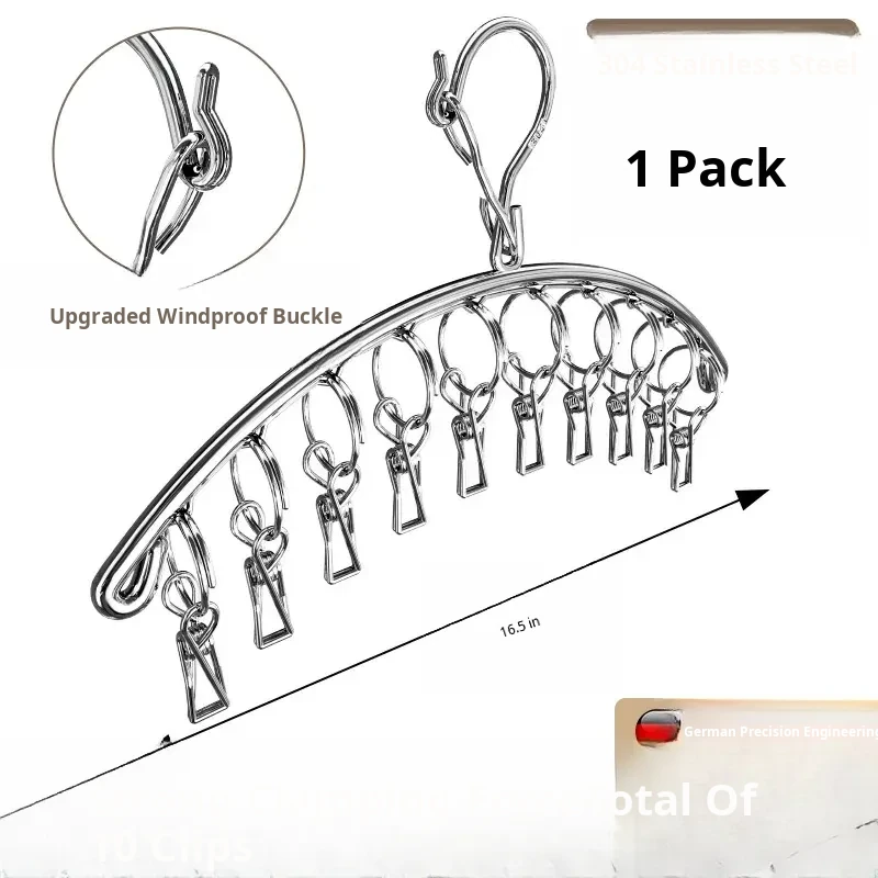 Heavy-Duty 10-Clip Curved Hanger - Upgraded Windproof Buckle (304 Stainless Steel) - Single Pack