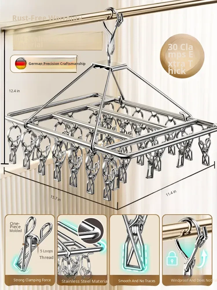 Heavy-Duty 30-Clip Square Clothes Hanger [304 Stainless Steel] with Upgraded Windproof Clips