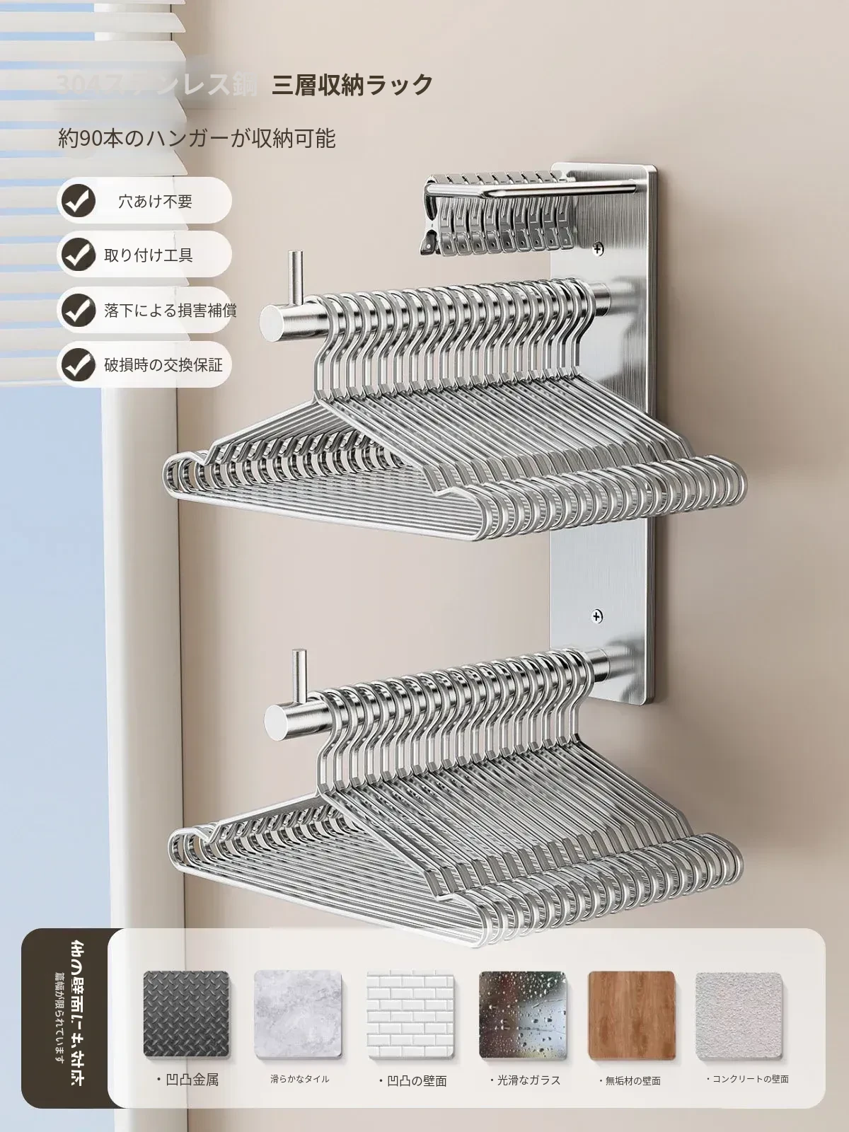 【304ステンレス】 三段ハンガー収納ラック【約90個のハンガーを収納】