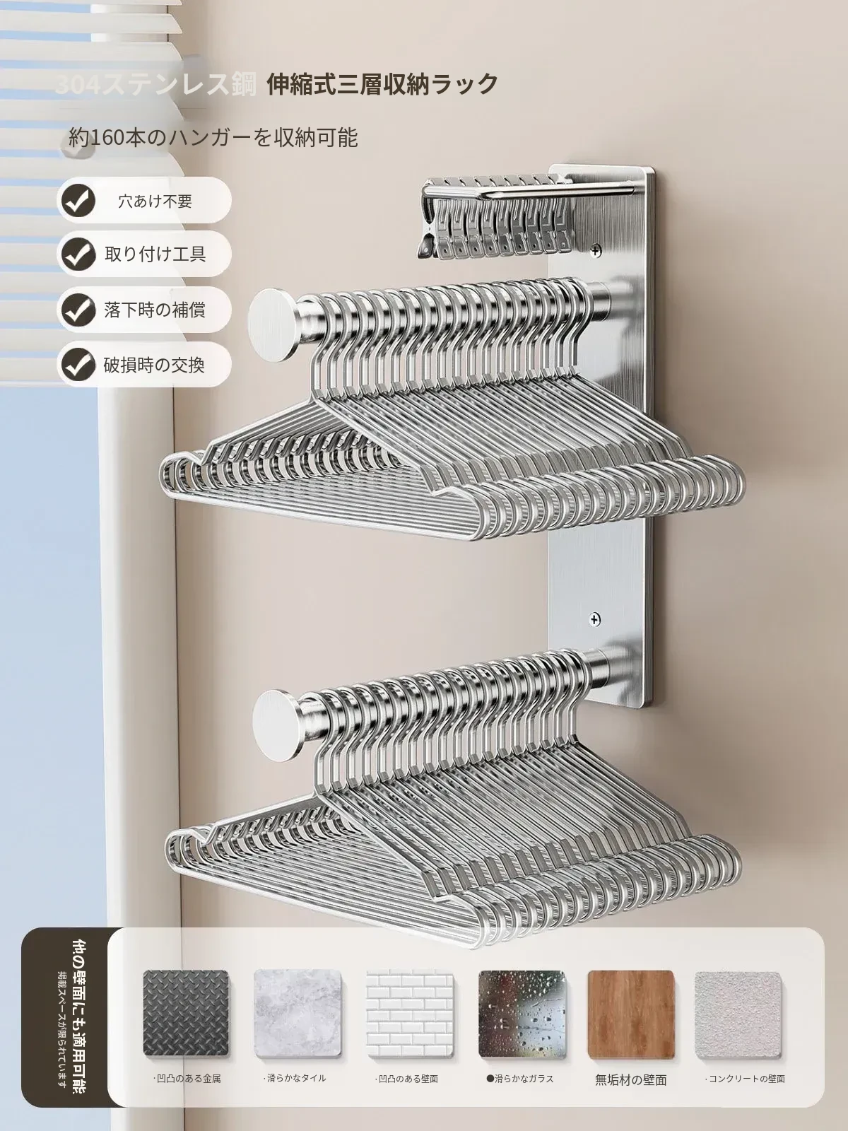 【304ステンレス】 伸縮式三段ハンガー収納ラック【約160個のハンガーを収納】