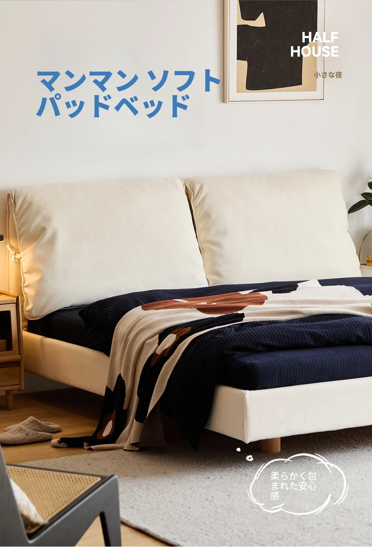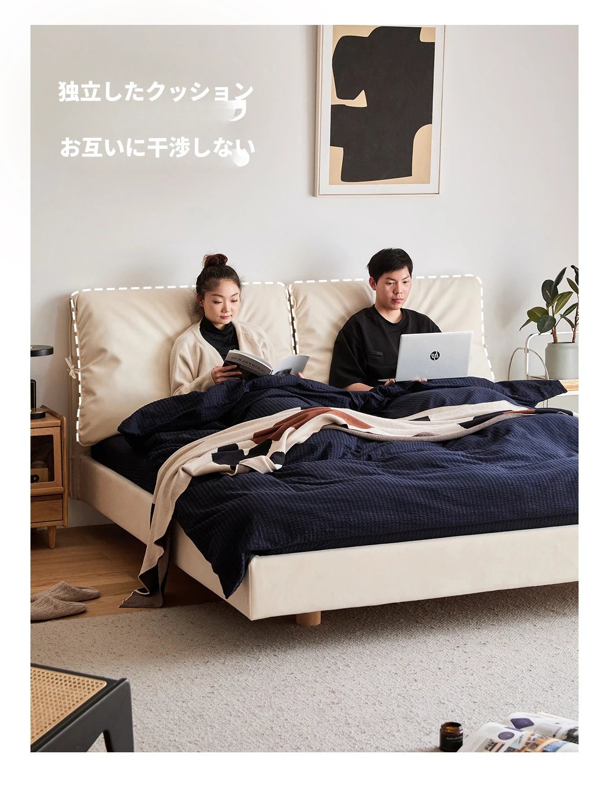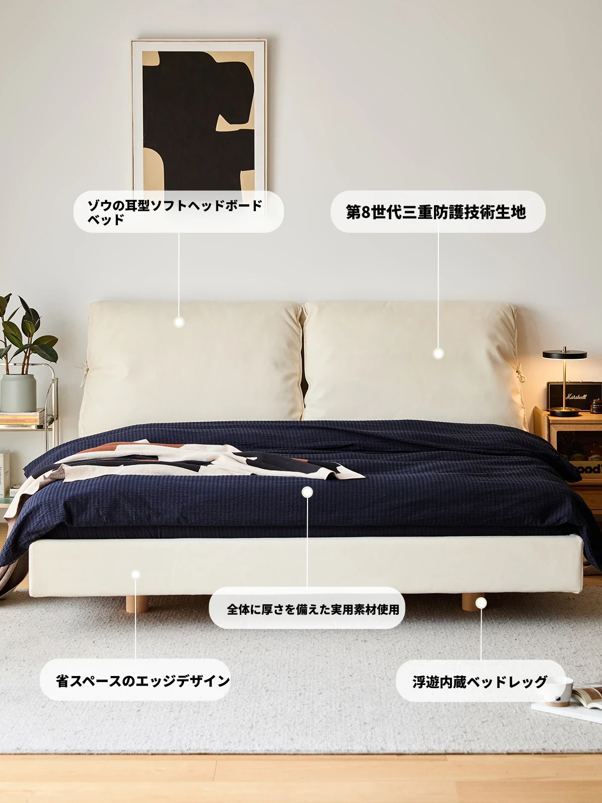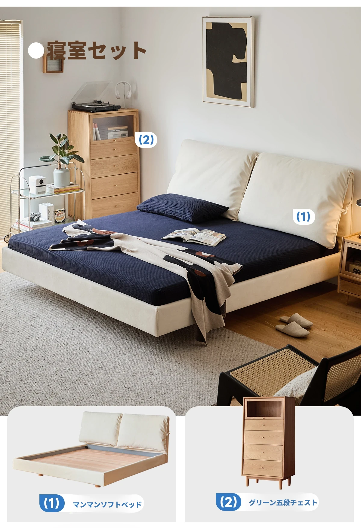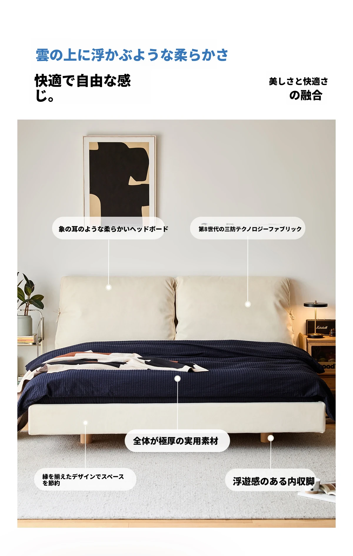 北欧風ミニマルデザイン半端ベッド - 浮遊感を演出する二人用天然木製家具、スタイリッシュで快適な毎日へ