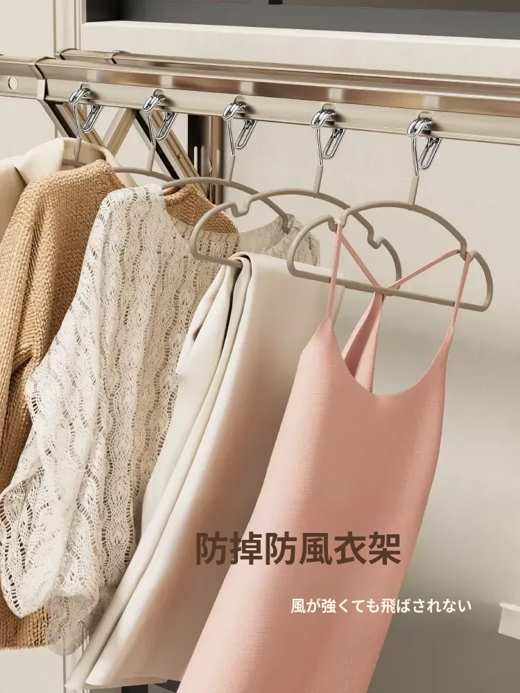 風を防ぐ!自動ロック式の衣類ハンガー - 落下防止で安心!アウトドアや家庭用バルコニーに最適な頑丈な鉄製ハンガー。高所でも安心して使用できる特別設計!