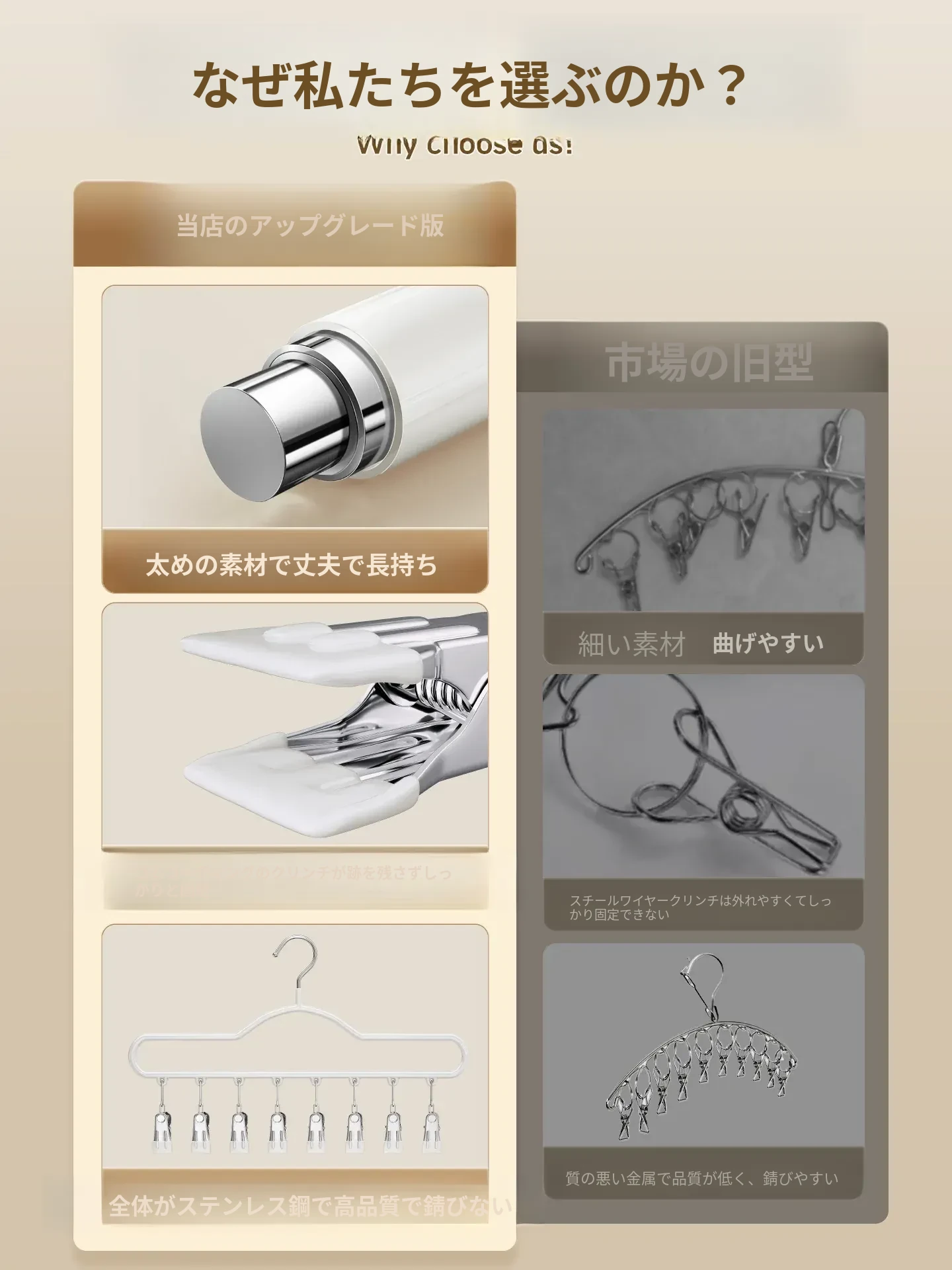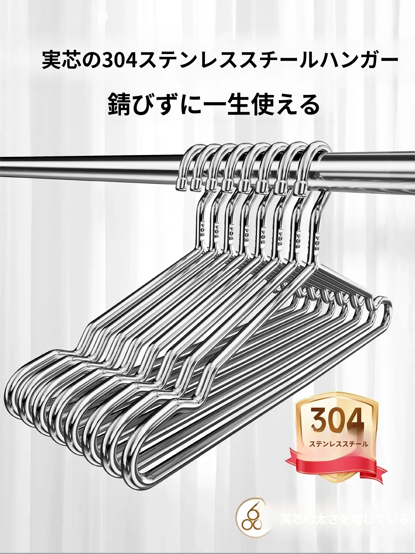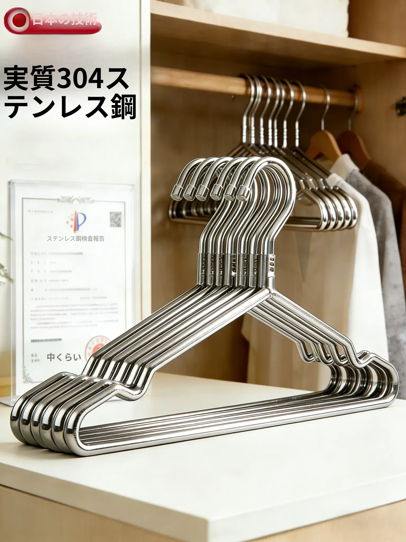 日本製304ステンレス製ハンガー、頑丈で滑り止め効果抜群!無痕デザインで衣服を傷めず、家庭用に最適な大容量ハンガー。衣類の乾燥や収納もこれ一つで安心!