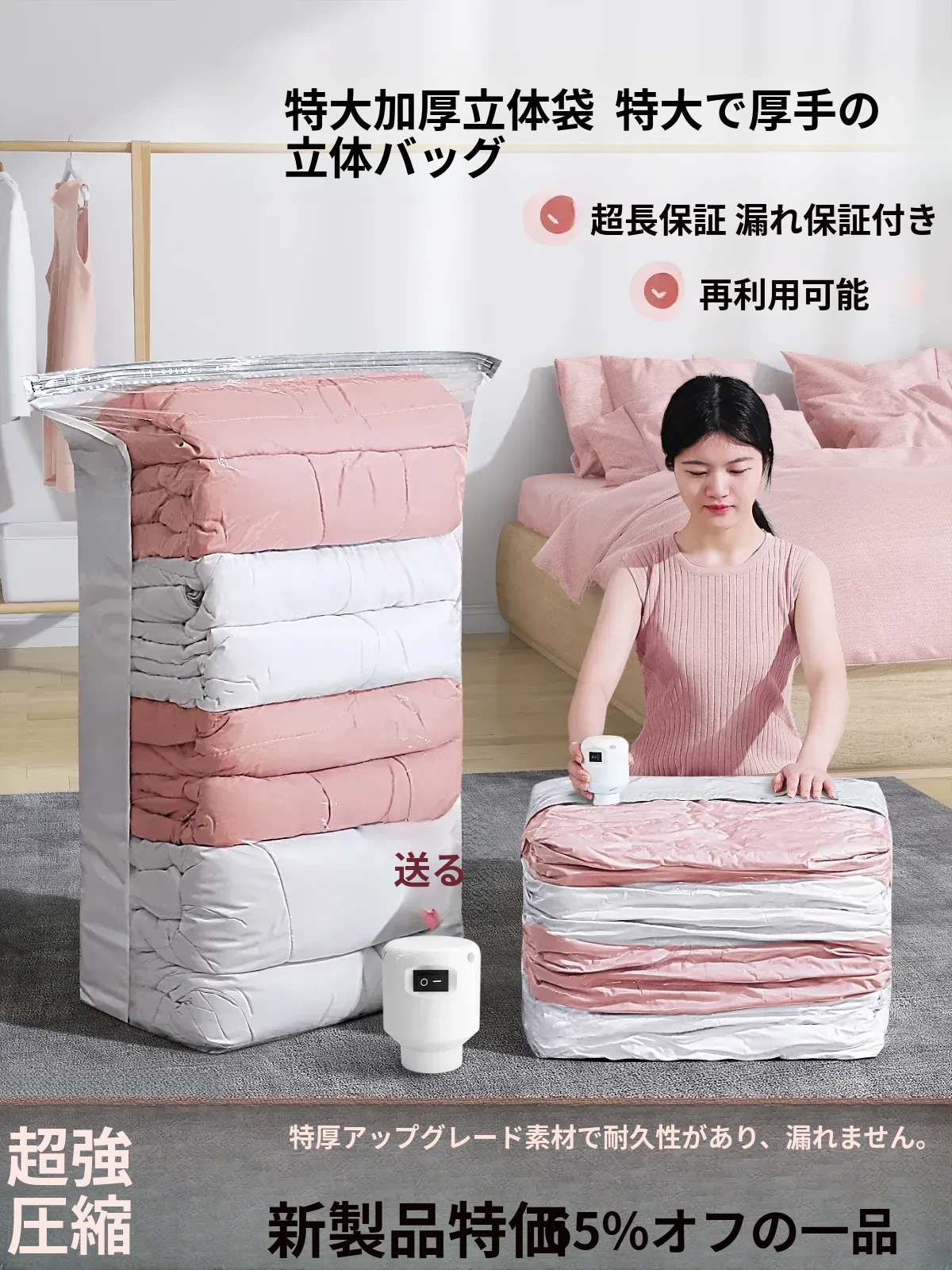 真空圧縮袋 衣類・布団専用収納バッグ!旅行にも最適な厚手デザインで、空気を抜かずに簡単収納。衣類や寝具をコンパクトにまとめて、スペースを有効活用!家庭用にもオススメです。