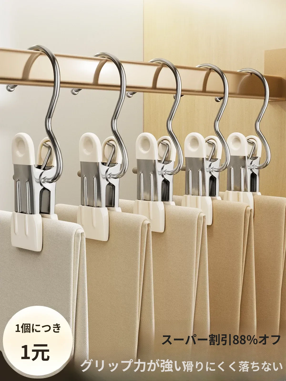 家庭用無痕ステンレス製マルチ機能クリップハンガー - スカートやズボンをスッキリ収納!便利なフック付き、すっきり片付けて、お部屋をおしゃれに演出!