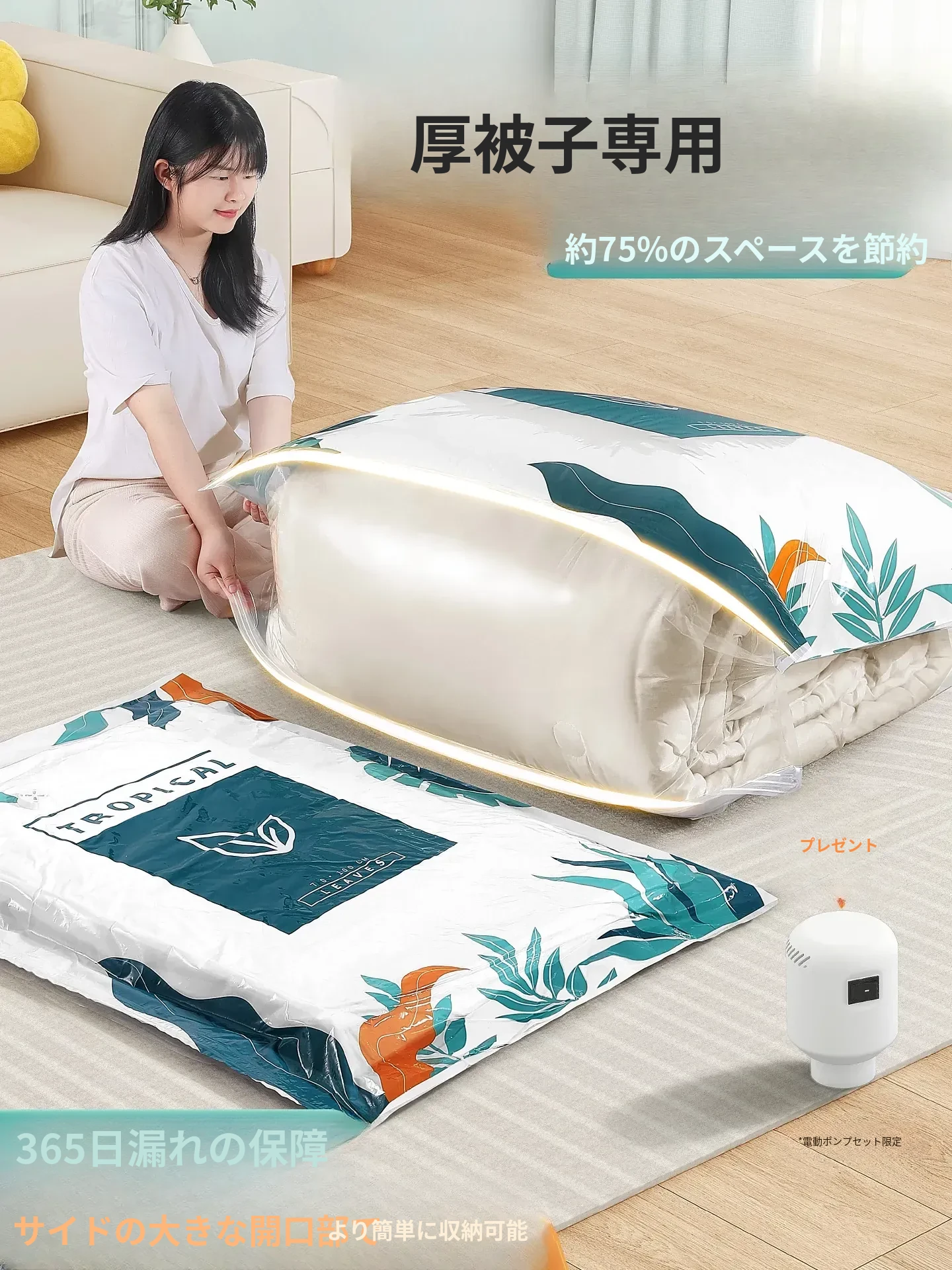 厚手真空圧縮袋 - ふんわり布団や衣類をスッキリ収納!空気を抜いてコンパクトに!羽毛布団やダウンジャケットにも最適な収納アイテム!