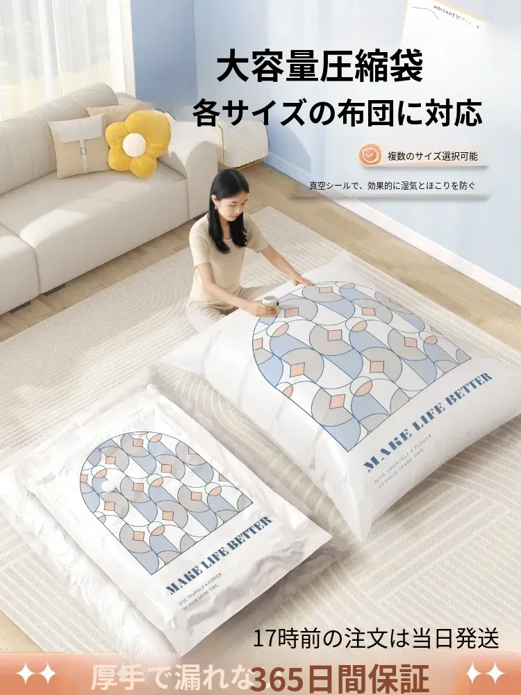 防水防潮真空圧縮収納袋|衣類・布団専用|ダウンジャケットもスッキリ収納!空気を抜いてコンパクトに!衣類や布団をしっかり守る、収納革命の必需品!