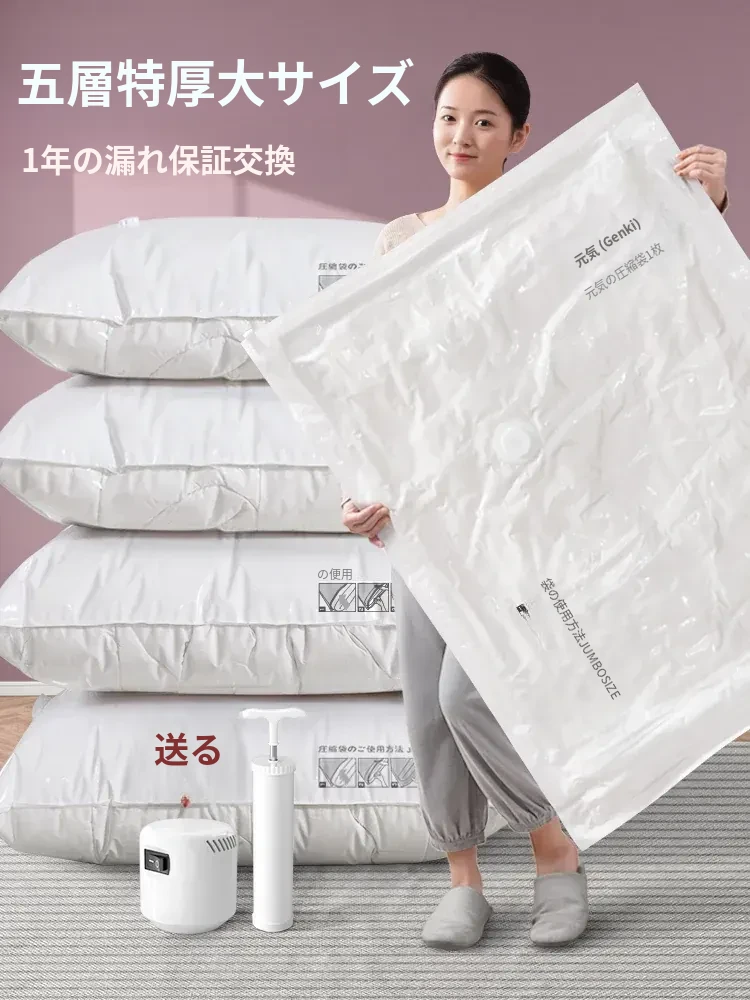 真空圧縮バッグ - ふとんや衣服をすっきり収納!家用抽気袋、ダウンジャケットも安心の厚手仕様。専用電動ポンプ付きで簡単に真空化!収納スペースを最大限に活用しましょう!