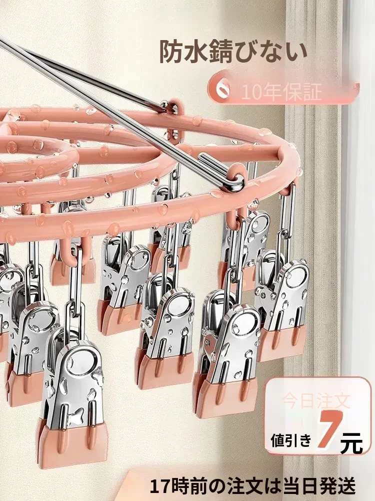 ステンレス製多機能物干しハンガー!靴下や衣類を一度にしっかり干せる便利なクリップ付き。丸型デザインで省スペース、家庭での使用に最適です。洗濯物をおしゃれに干して、毎日の生活をもっと快適に!